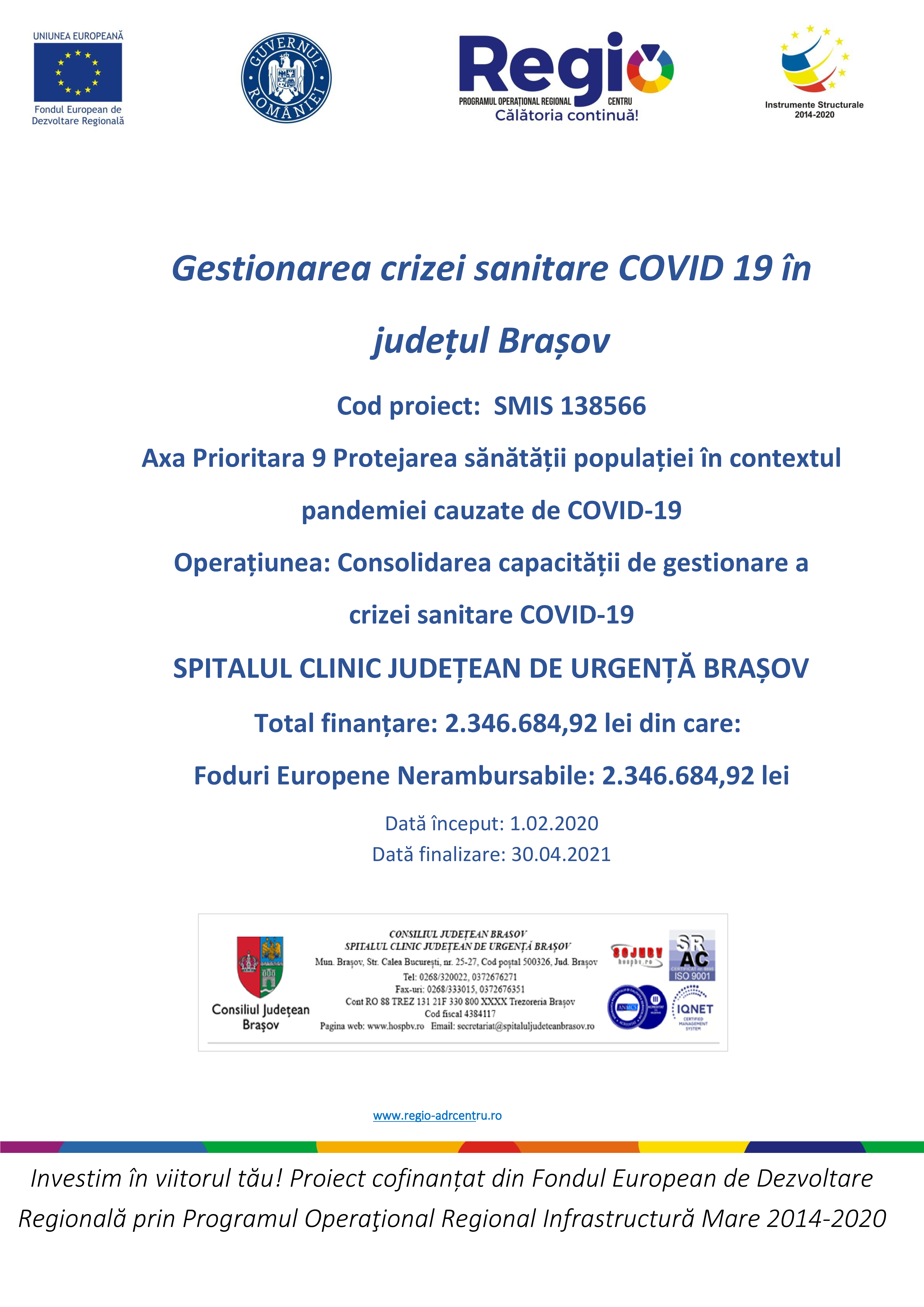 Proiectul "Gestionarea crizei sanitare COVID 19 în județul Brașov." Cod SMIS 138566, finanțat prin Proiect cofinanțat din Fondul European de Dezvoltare Regională prin Programul Operaţional Regional Infrastructură Mare 2014-2020